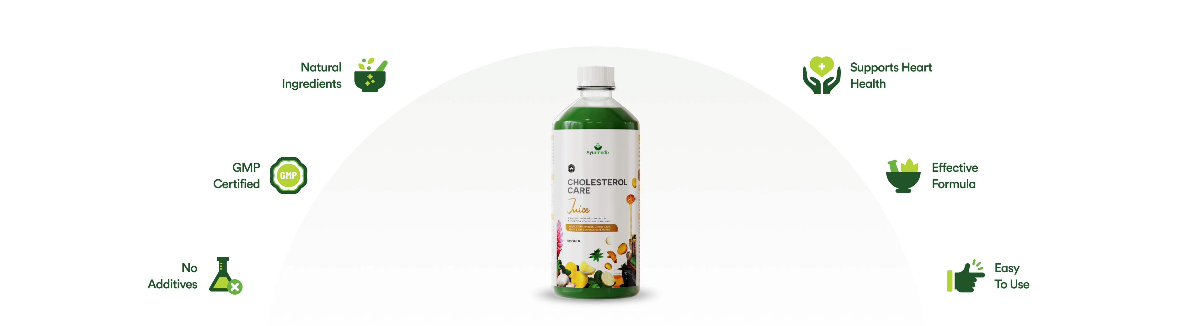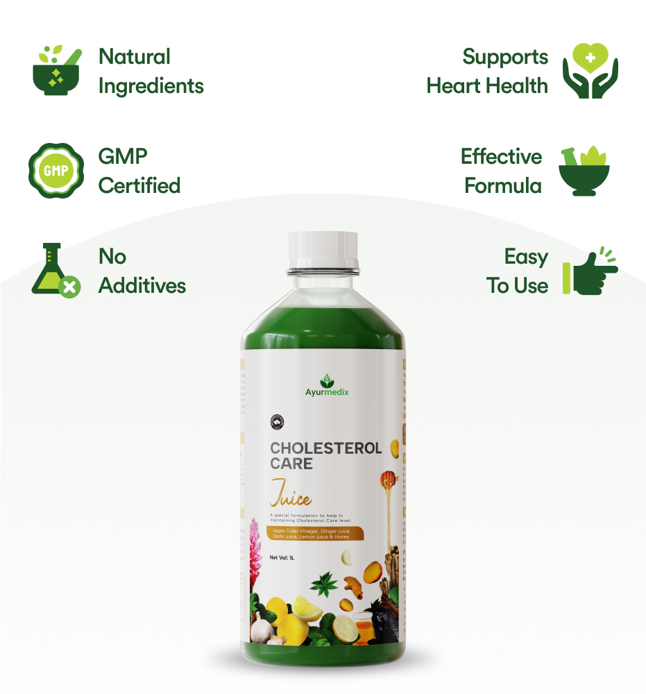 Ayurmedix Cholesterol Care Juice is designed to promote heart health and manage cholesterol levels naturally. This herbal formula combines potent ingredients known for their beneficial effects on cardiovascular wellness.